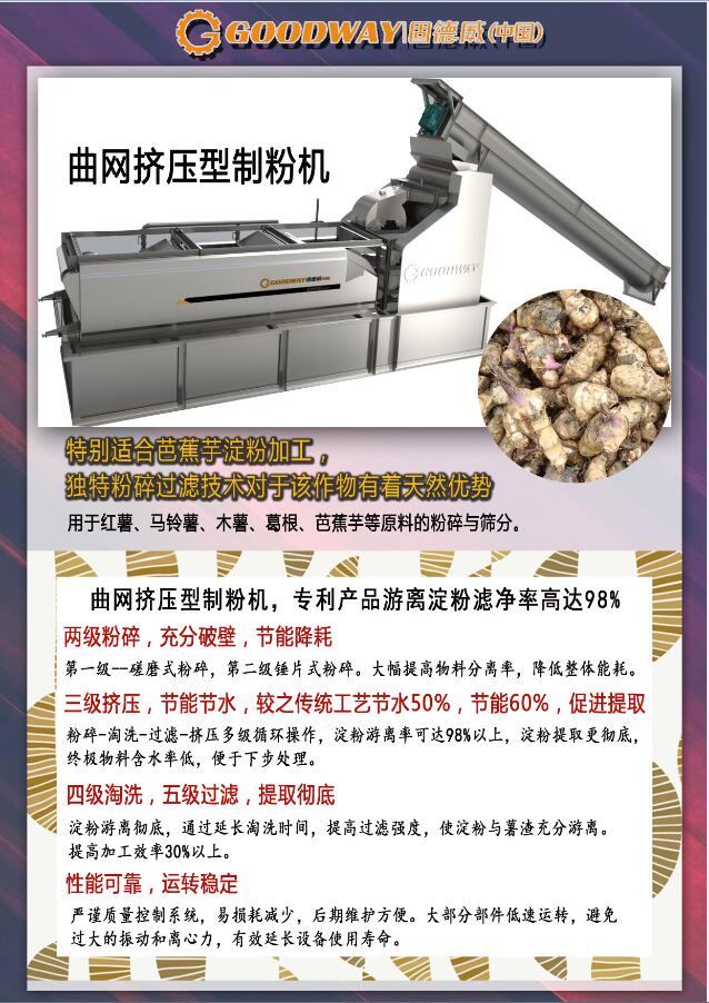 曲網(wǎng)擠壓型制粉機,對于芭蕉芋淀粉加工有著天然優(yōu)勢,獨特的粉碎方式和壓濾提取方式,保證粉碎過濾。充分粉碎物料,不僅提高淀粉提取率,還能提高淀粉濾凈率。