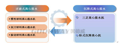 離心脫水機(jī)根據(jù)脫水物料顆粒度粗細(xì),可以分為兩大類:過濾式離心脫水機(jī)和沉降式離心脫水機(jī)。過濾式脫水有根據(jù)卸料方式的不同分為:慣性卸料、刮刀卸料和振動卸料三種。沉降式離心脫水機(jī)根據(jù)產(chǎn)品結(jié)構(gòu)可以分為三足離心脫水機(jī)和臥式沉降離心機(jī)兩種。其中過濾式離心脫水機(jī)主要用于較粗物料的脫水,沉降式離心脫水主要用于細(xì)顆粒物料的脫水。