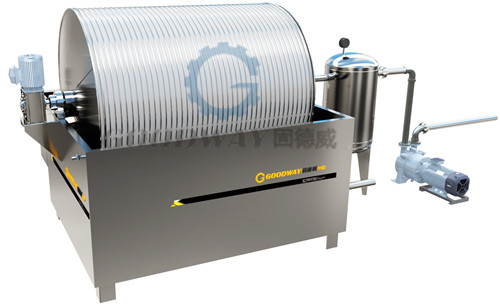 過濾脫水的基本原理是采用恒壓餅層架橋過濾原理,工作時(shí)由調(diào)速電機(jī)驅(qū)動轉(zhuǎn)鼓在漿槽里旋轉(zhuǎn),固體物(濕淀粉)被吸附在轉(zhuǎn)鼓的濾布上,達(dá)到一定厚度時(shí)被固定的刮刀將固體物刮下,濾液進(jìn)入汽水分離器,從而達(dá)到淀粉、水、氣分離的目的。常用的過濾方式又根據(jù)過濾動力的不同分為:重力脫水、真空脫水、加壓脫水和離心脫水四種。